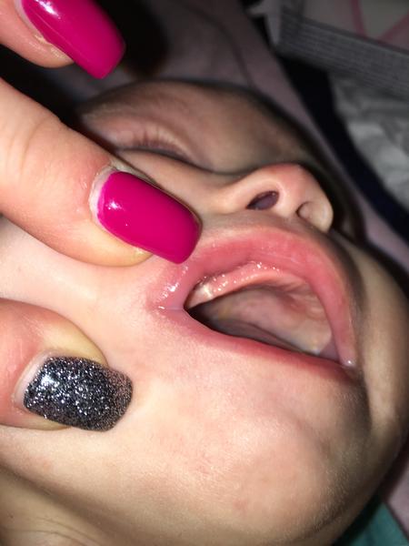 Toto iste má aj moja dcéra. Všimla som si to keď mala 2 mesiace. Moja to ale má aj na druhej strane a skoro všade je aspoň trošku biele. Bola som u lekára a všetky vyšetrenia, výtery boli negatìvne, čiže vylúčili huby aj infekciu. Asi zuby je viac vidno ako zvyčajne. Myslím že to isté u vás. Teraz ma 5 mesiacov a stále je to také a už má prvý zubok aj vonku.
