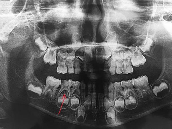 RTG vyzera takto. Dole oznaceny zub je vonku. Tie horne 6-tky + ostatne horne trvale co sa tlacia moze trvat este xy mesiacov kym sa to pohne, dovtedy co? 😓