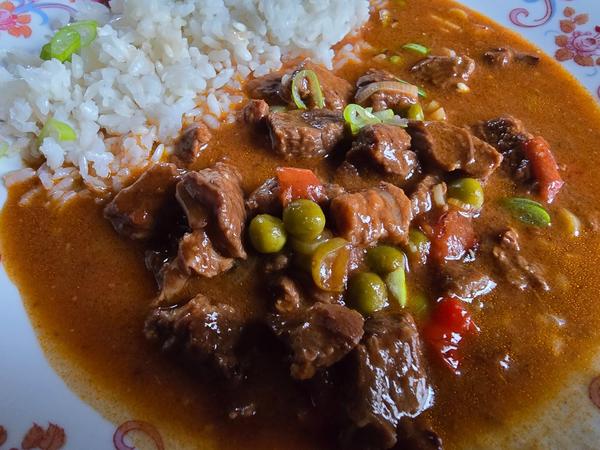 Akurát som ho v nedeľu varila. Hovädzie mäso s hráškom. Podáva sa s ryžou a posypaný syrom.