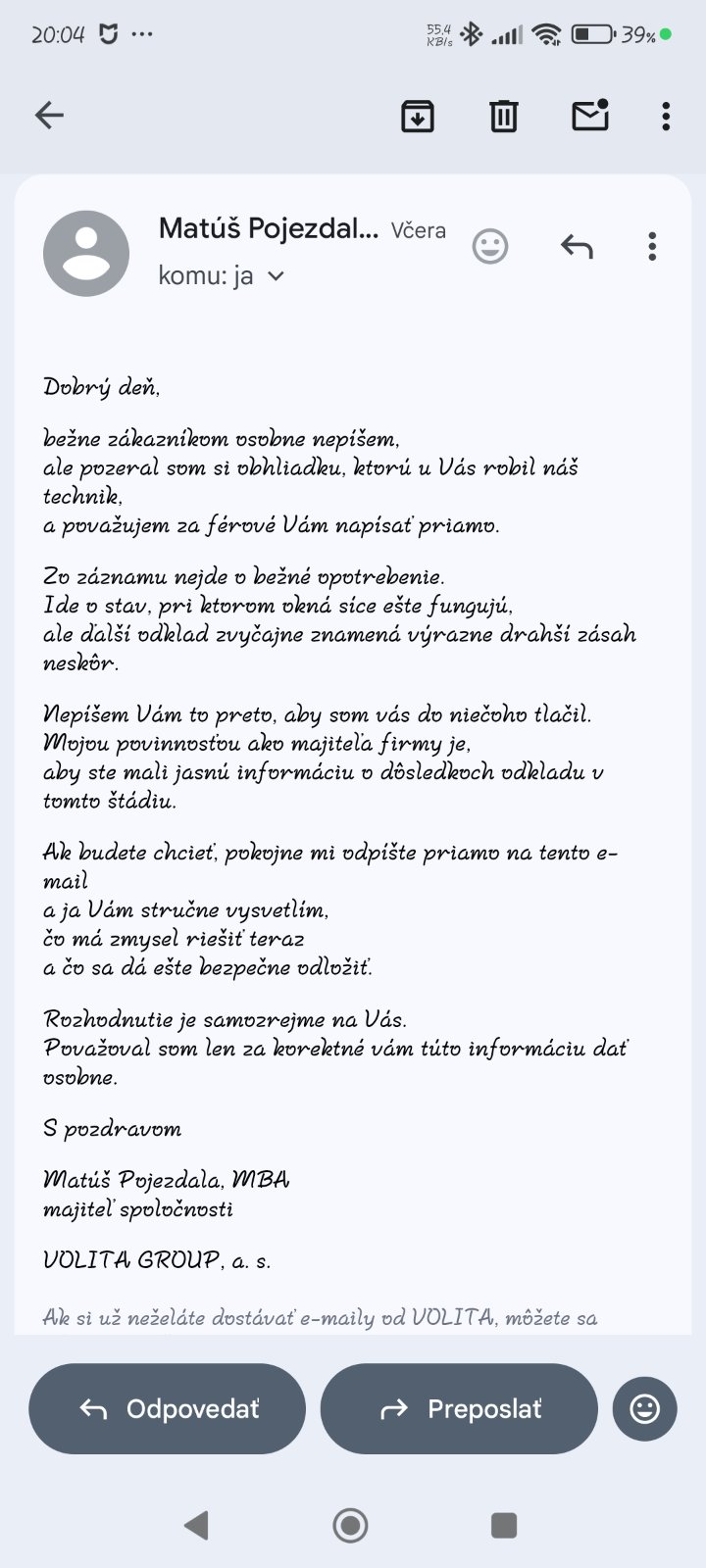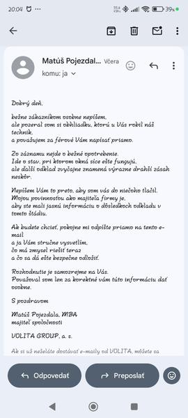 Ale čuduj sa svete. Prišiel mi email z volity. 😁 Taký natlak že dovidenia. Už len po tomto emaily by som zrusila všetko od nich, keby som tu aj žiadneho druhého technika nemala. Síce som odpísala klamstvom aby ma ďalej neotravovali (priznavam) ale spravila som si svoj názor. Mám pocit že sa ešte ozvú. Ja ale ruším všetky servisy ktoré máme od nich objednane a poviem im kľudne pravdu že prečo 👌