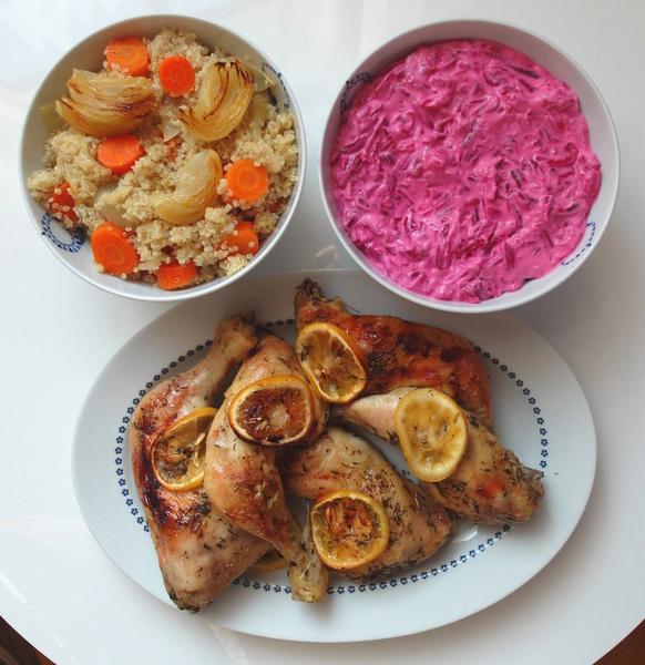 Vyskúšaj napríklad pečené kurča s citrónom a qunioovou prílohou a dresingom z jogurtu a cvikle
