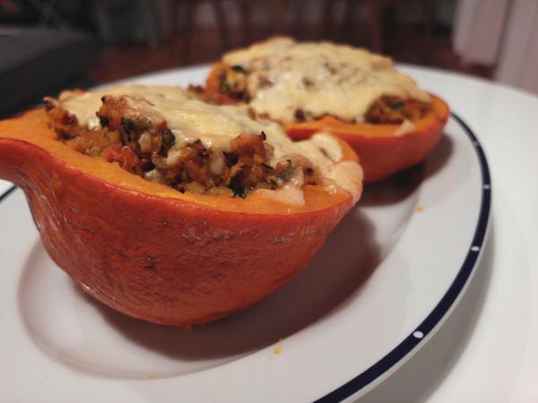 alebo ak chceš niečo vegetariánske, odporúčam tekvica plnenú quinoou, šošovicou a šampiňónmi so syrovou kôrkou
