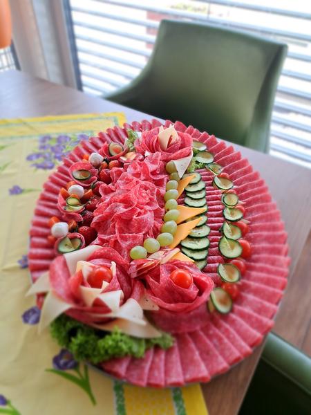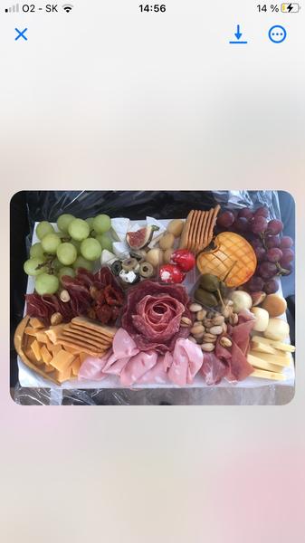 Dávam 2 druhy šunkovej misy 2 druhy suchej salámy .. bud to len poukladám a ked je cas sa s tim pekne vyhram a samozrjeme syr nesmie chýbať... plátkový a mozzarella.. a zelenina uhorka rajcina paprika u nas ide aj mix salat