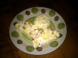 dnes : klasiku zemiakový šalát s majolenkou , hráškom, mrkvou , vajíčkami , cibuľkou , uhorkami + rybka . A ešte som robila tortu KRTKA a vydarila sa
