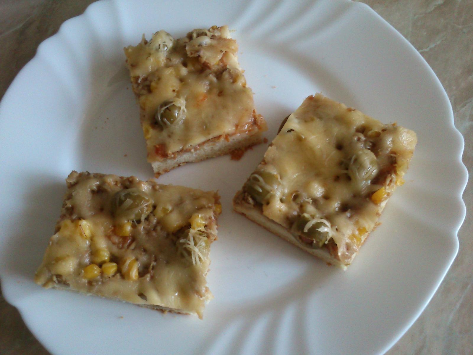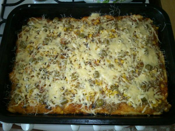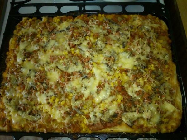 dnešná pizza: šunka, šampióny, kukurička, syr a tuniak, kukurička, olivy, syr, jahodový kokteil a jahodová bublaninka, práve som ju dopiekla, to je vôňa 😉