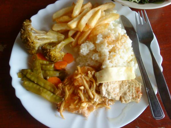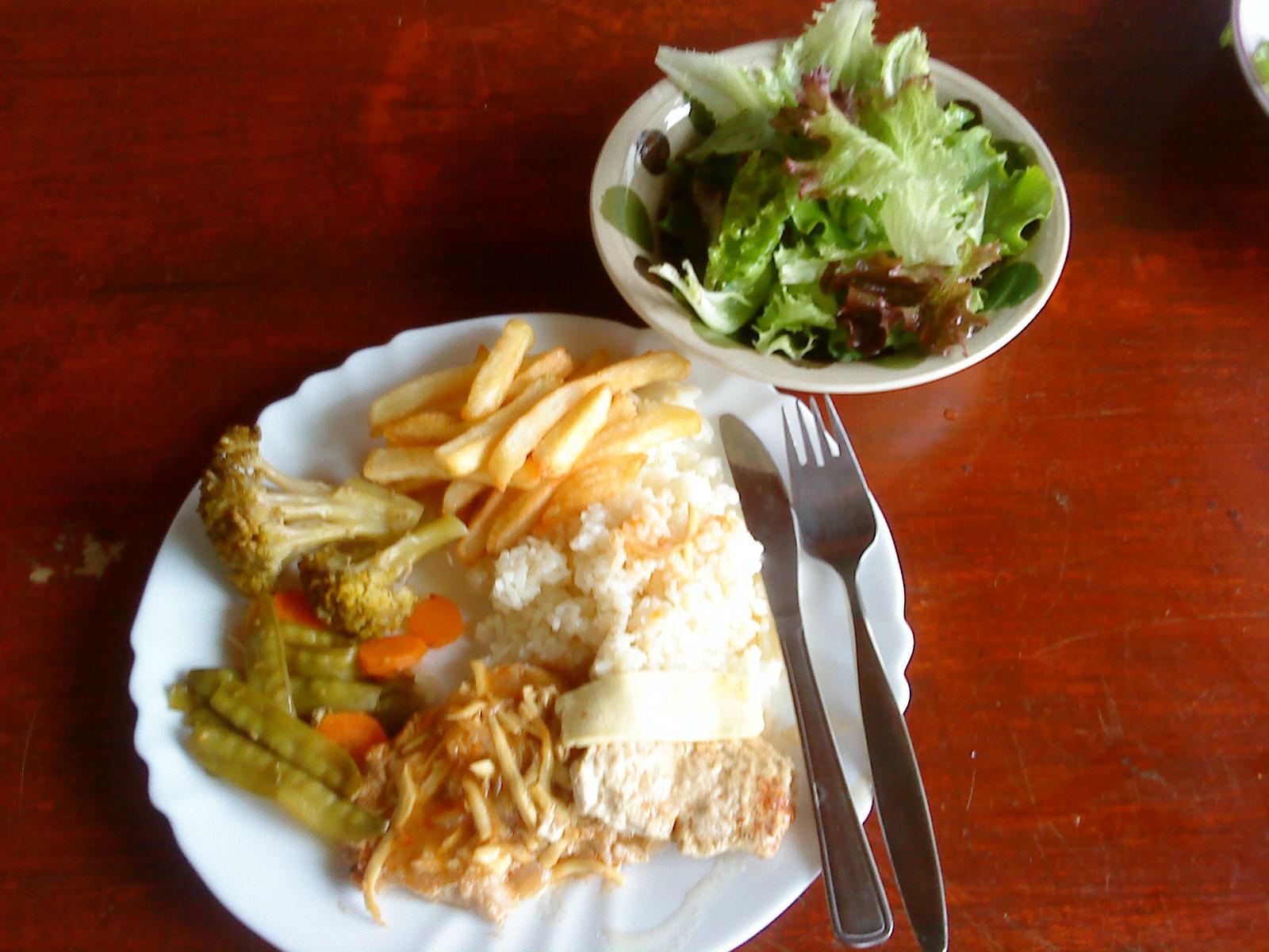 dnes klasika vývar z bravčových kostí so zeleninou a slížikmi, bavčové karé v horčicovo-smotanovej omáčke z parného hrnca, pizza rezne z bravčového karé, ryža, hranolky, farebný hlávkový a taliansky šalát (lollo rosso a lollo biondo) zo záhradky, zeleninka z parného hrnca - brokolica, mrkvička a strúčiky hrášku - prvýkrát som nasadila aj túto odrodu, ktorá sa konzumuje celá aj so strúčikom a je mňáááám 😉 foto dosť nekvalitné, a obedovali sme v záhrade v altánku
