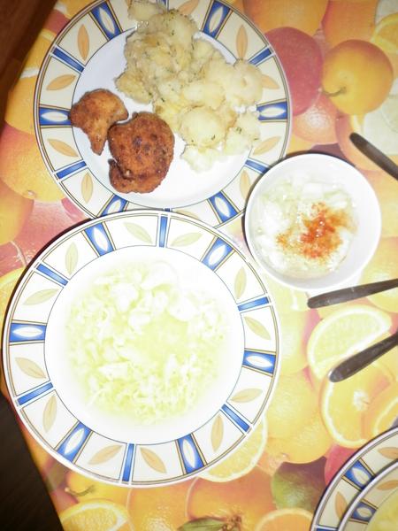 Dnes mame karfiolovu polievocku, bravcove masko na hrasku + ryza a hlavkovy salatik 🙂