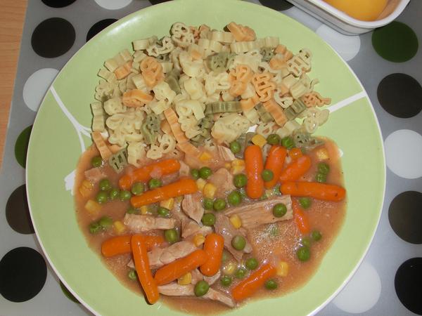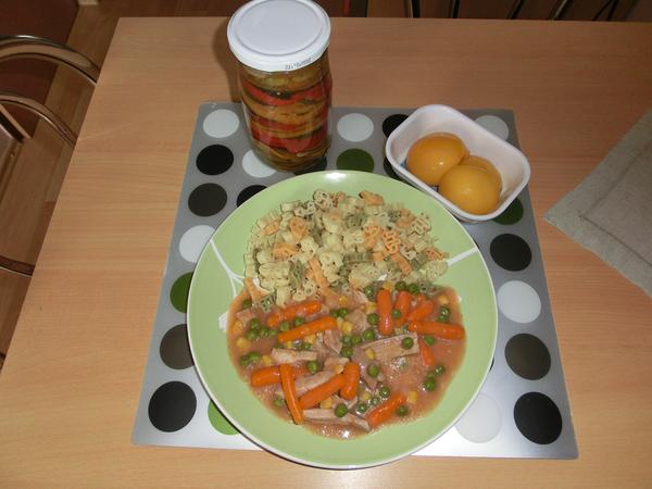 ... tak milé kucháročky ... u nás dnes bolo dusené bravčové stehno s hráškom z babkinej záhradky a mrazenou baby karotkou a kukuricou, no a k tomu synčekove obľúbené zvieratkové farebné cestovinky ... no a nechábali pre Peťulka vlastnoručne zavárané broskyne a pre mňa s ocinkom domáca zaváranina na kyslo - cuketa, mladá tekvica, kápia prekladané cesnakom (babkina práca 🙂 ) .... zajtra nás čakajú vybavovačky, takže som toho uvarila viac a zajtra máme navarené 🙂 😉