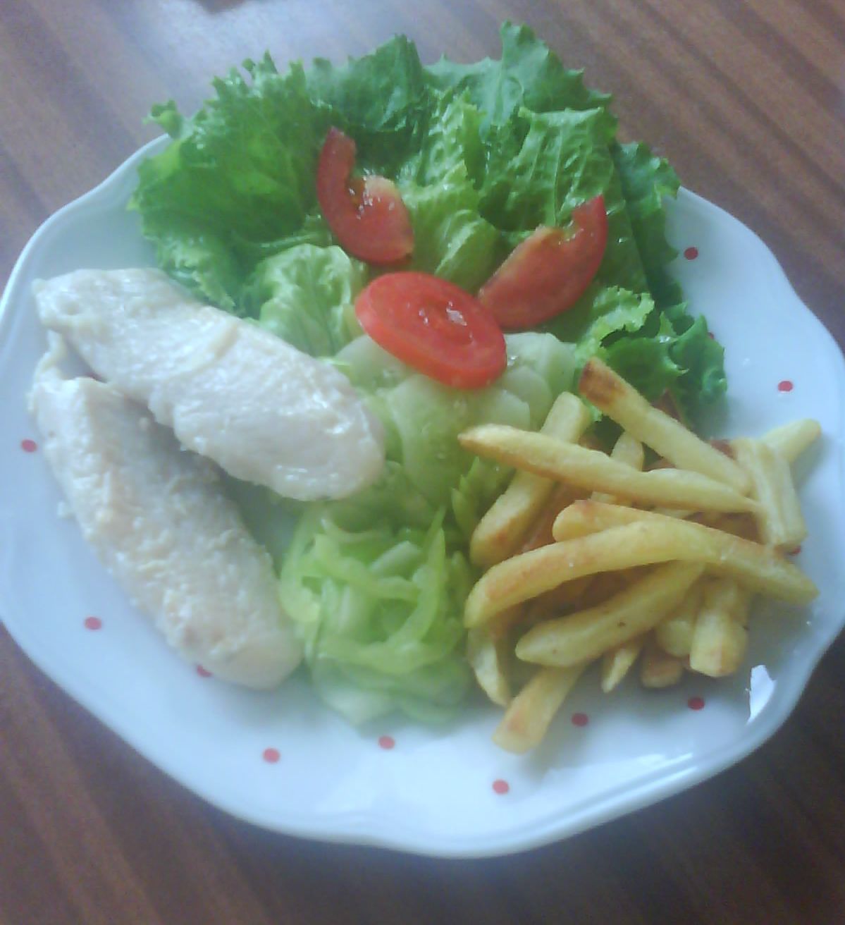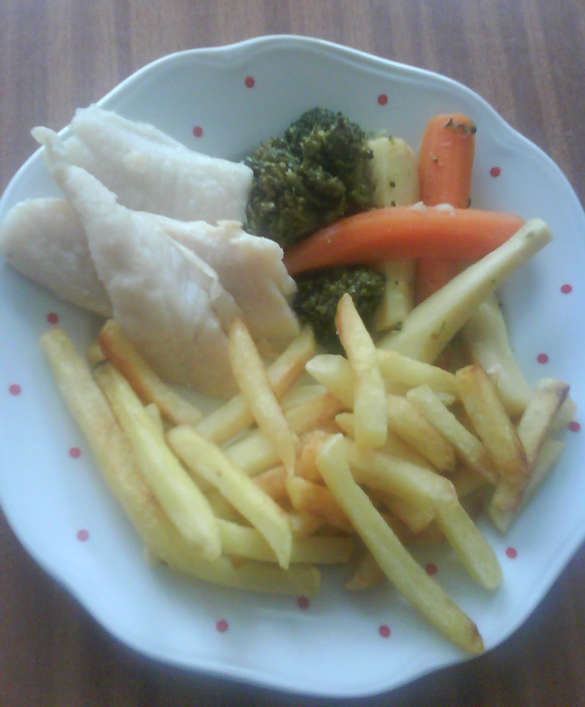 Naše včerajšie menu. Z pečenej ryby nič nebolo....robila sa len dusená, kvôli hranolčekom. A poobede sme naše papanie zavŕšili koláčikom z ryžovej múky s pridaním CAROB-u, posypané ananásom. Manžel si na nich pochutnal 🙂 , dokonca si pribalil aj do roboty. 😉