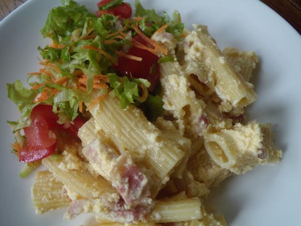 Mnozstvo omacky zalezi na vas. Ja robim na 500g cestovin omacku zo 5 vajicok, cca 200ml kyslej smotany a mlieko podla toho ake huste to chcem mat a tiez kolko nastuhaneho syru pridam. Suroviny na omacku sa vsetky zmiesaju este predtym ako ich pridame k opecenej slaninke. Miesame na miernom ohni, tak aby vajicka neboli surove a vsetko sa to pekne prepojilo.
