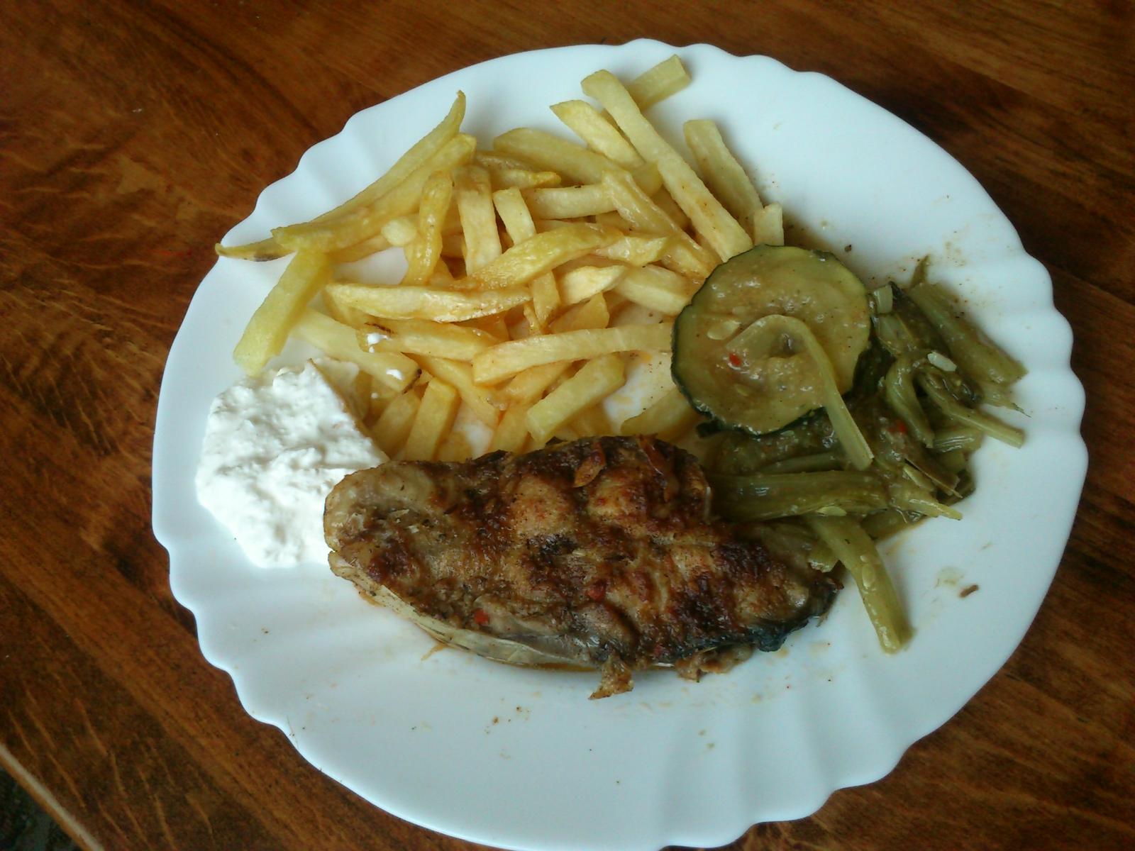 dnešný pečený kapor, hranolky, cuketa a stonky mangoldu na pare s koreninami, bylinkami a cesnakom, celozrnný chlebík so slnečnicovými semienkami 😉