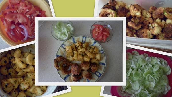 my dnes máme len taký jednoduchý obedík...vyprážaný syr s hranolkami, zeleninový šalátik a zo včera fazulová polievka 🙂