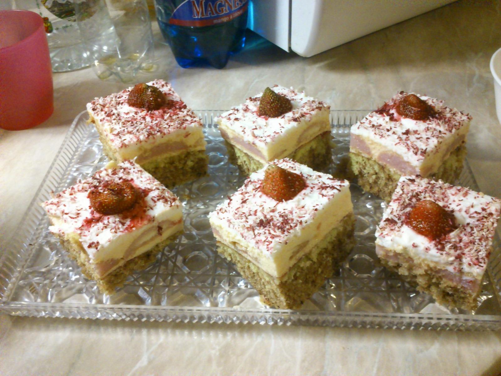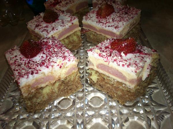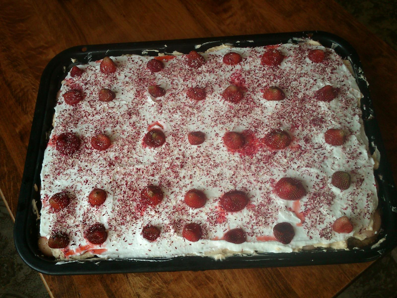 Náplň: Ve vode uvaríme puding s cukrom na hustý krém. Po vychladnutí pridáme maslo. Vrstvíme na seba:Cesto-džem- trocha krému, piškóty namáčané v sirupe, zvyšok krému, šlehačka a nakonec ozdobíme nastrouhanou čokoládou, ja som ozdobila jahodami a zafarbeným kokosom