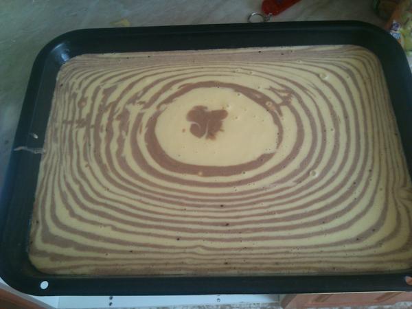 Cesto: Bielky s cukrom vyšľaháme,pridáme žĺtky,olej,vodu a múku s práškom do pečiva. Cesto rozdelíme na dve polovice a do jednej zamiešame 2 PL kakaa a do druej dáme 2 PL polohrubej múky. Plech vyložíme papierom na pečenie a dávame po 2 PL z každého cesta striedavo vždy do stredu na rovnaké miesto. Po upečení potrieme jahodovým džemom.
