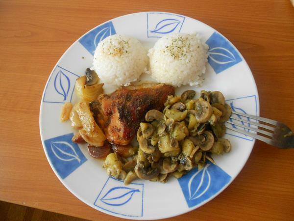 dojedáme vývar z morčacích krkov a dnes morčacie soté s hlivou + ryža a zeleninový šalát