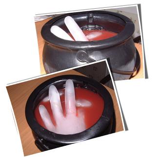 (Polievka je rajčinová, ruku vyrobíme tak, že do chirurgickej rukavice napustíme vodu, zaviažeme a dáme zamraziť, rovnako aj oči - do plastovej nádoby na vajíčka dáme čučoriedku alebo čiernu ríbezľu, dolejeme vodou a dáme zamraziť, potom vyklopíme, ruku tiež vyberieme z rukavice a všetko pred podávaním vhodíme do polievky).