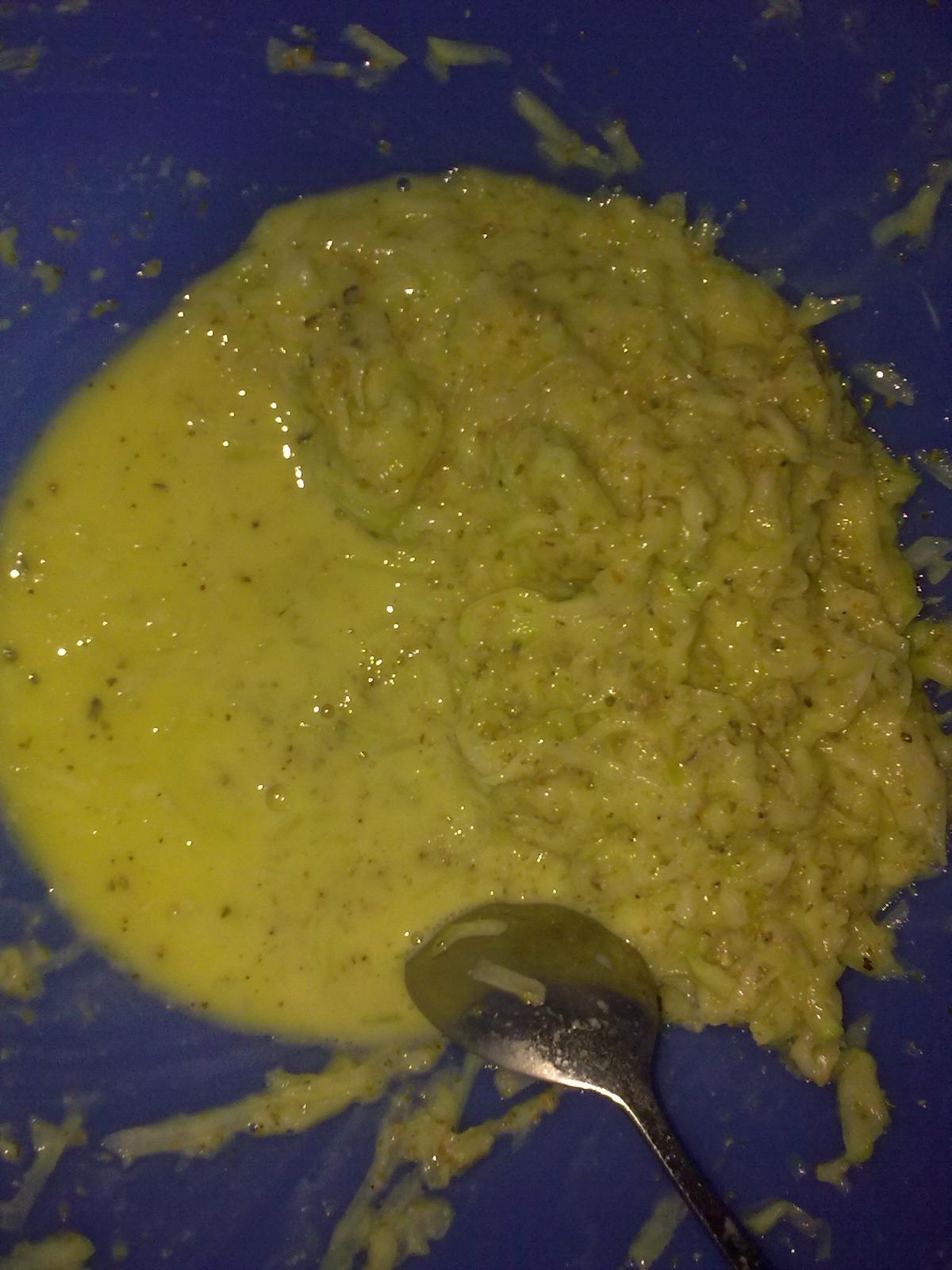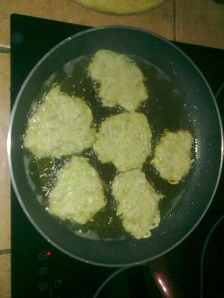 po nastrúhaní cukety alebo patizónu osolte a nechajte stiect vodu, ona ešte aj po vymiešaní stečie a tiež ju dám preč....nemusíte tam potom dávať veľa múky...ja dávam cesnak..veľa, majoránku dve vajcia, sol, celozrnnú múku a vysamžiť menšie a čo najtenšie poriadne nechat do chrumkava... a kedže sme boli v nedeľu na čočoriedkach tak samozrejme celozrnná bublanika s čučoriedkami a ešte čierne a červené ríbezle...