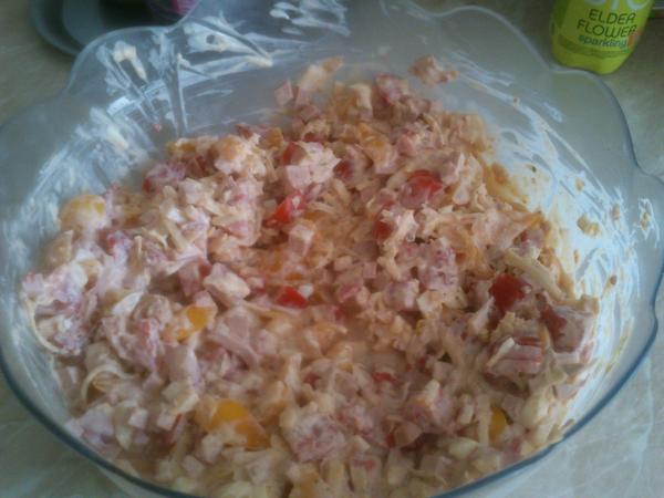 rajčiny nakrájam na kúsky, k tomu pridám nakrájané natvrdo uvarené vajíčka a mäkkú salámu, nahrubo nastrúhaný tvrdý syr, osolím, pridám troška čierneho korenia, sójovú omáčku, a kyslú smotanu a trocha tatárskej omáčky, zamiešam a hotovo, pre obmenu môžete pridať aj kukuričku, hrášok, koreniny podľa seba, ja dávam aj bazalku.