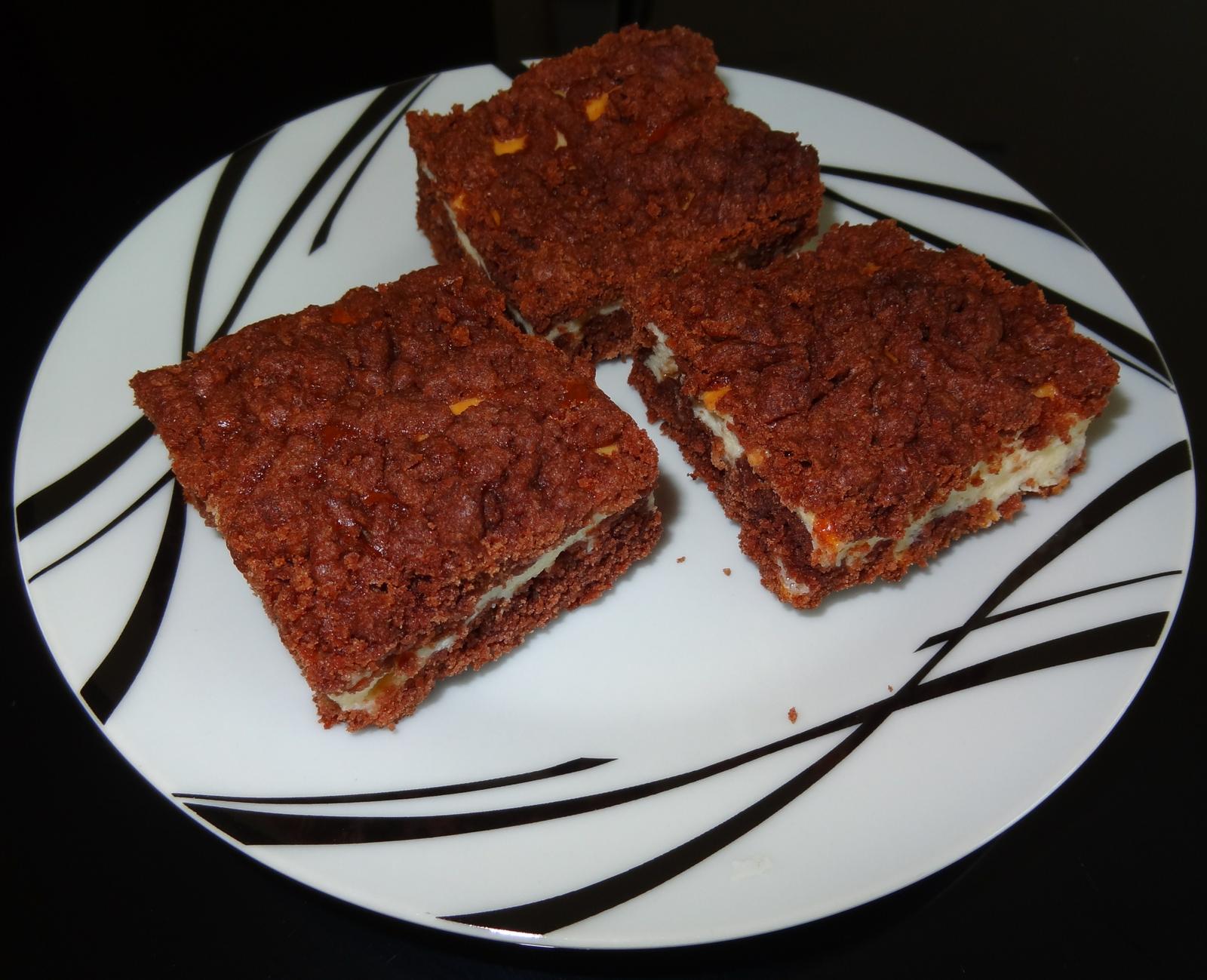 Cesto zamiesime a dáme do chladničky odpočinúť. Plnku zamiešame (mal by sa z bielkov spraviť sneh, ale ja som nerobila, zamiešala som to všetko naraz). Potom na vymastený a múkou vysypaný plech (ja som nemastila ani nevysýpala) nastrúhame polovicu kakaového cesta na strúhadle na jablká, na to rozotrieme plnku, na to nastrúhame druhú polovicu cesta a dáme piecť na 35-40 minút na 180stupňov