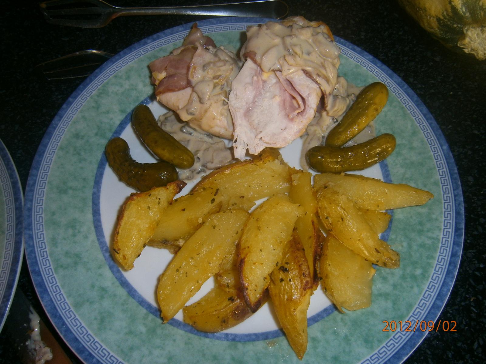 velmi rýchle a jednoduché - kuracie prsia som si naklepala, natrela na ne karičku syr, plátok šunku, plátok eidamu, zrolovala som to do rolky, opiekla sprudka zo všetkých strán a preložila na pekáč, dopiekla v rúre asi 15 minút na 200C 🙂 zemiaky klasika v rúre upečené 🙂