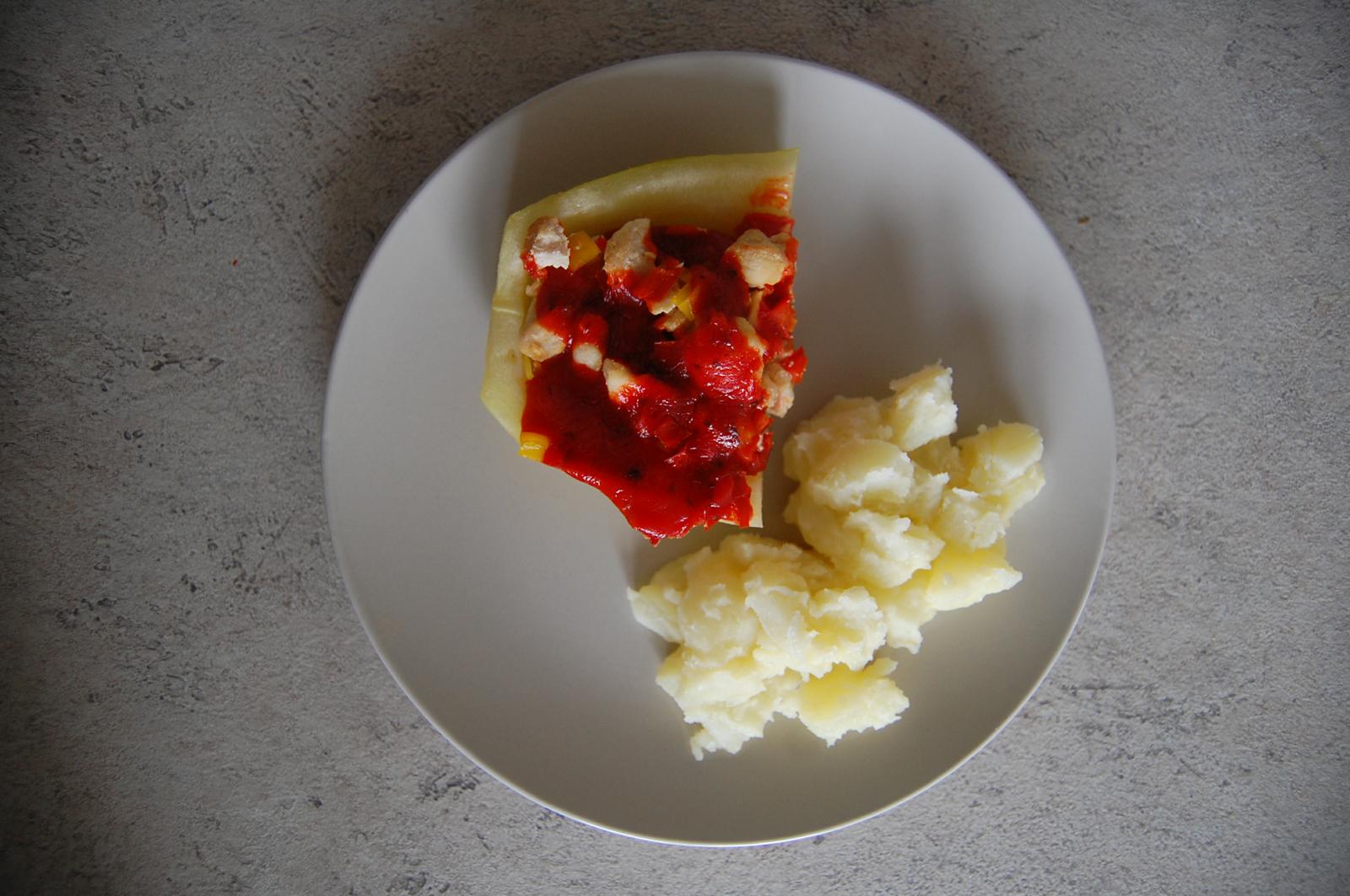 jej, no konecne sa mi podarila aj foto ukazka 🙂 takze polievka z domacich rajcin (ozajstnych, nepretlakovych 😉 ) s green pesto goudou a pre sasku vo verzii aj s cestovinovymi zvieratkami a hlavne jedlo - zapekana cuketa s kuracimi prsiami, cervenou a zltou paprikou a red pesto goudou a maslove zemiaky