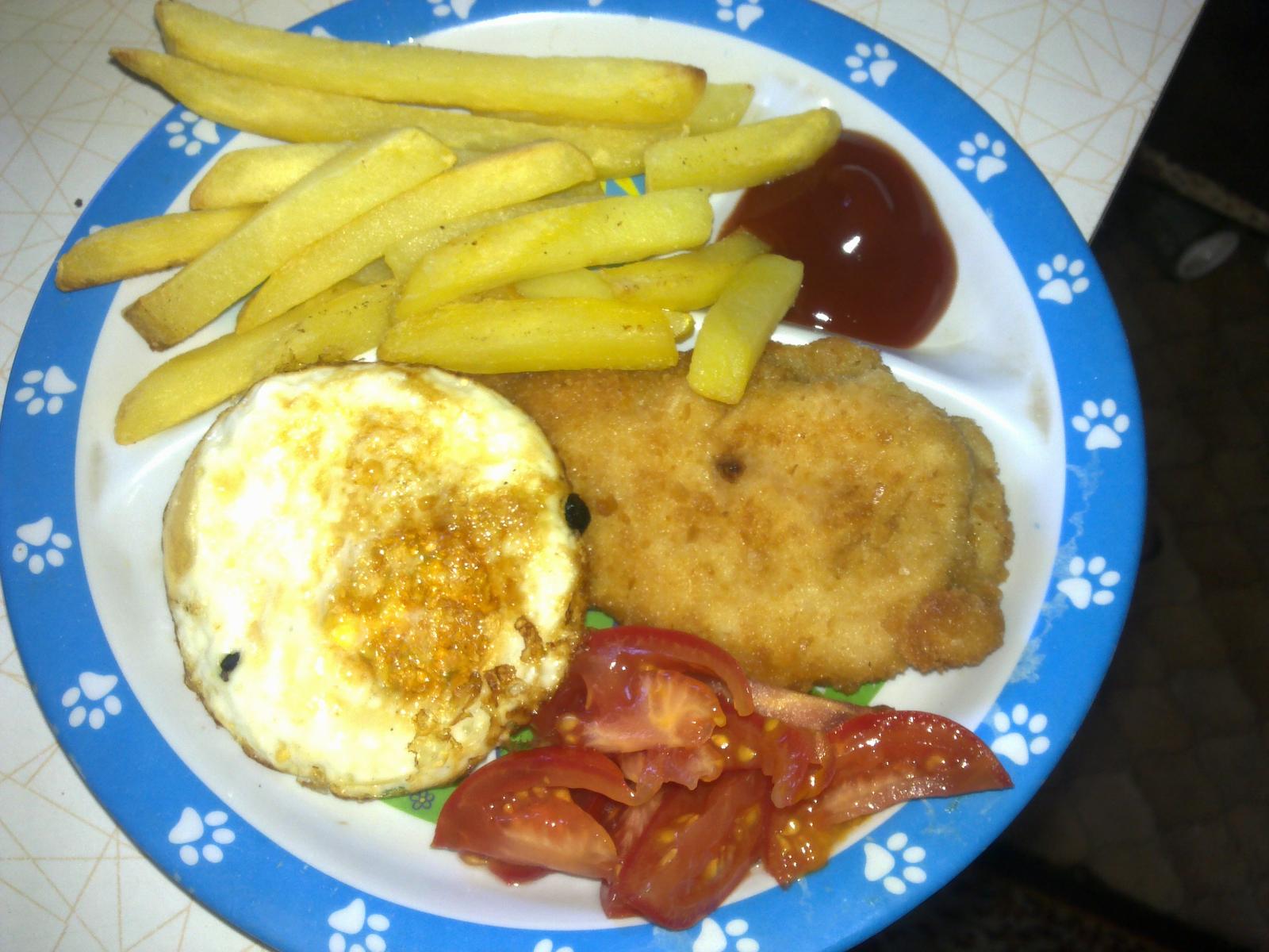 to len taketo dva kusky-aj to je vlastne len jedno prso prepolene,ona je velmi maličko-je ako prutik 🙂 tie tri rezniska okolo su Milanove a k tomu koooopec hranoliek.len to som nefotila oni si uz jedlo spravia sami 🙂