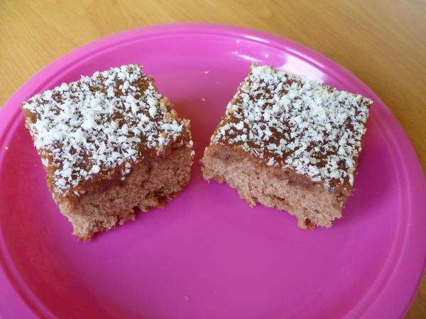 uvarime si jednu heru, 2 hrnceky krystaloveho cukru, 2 PL kakaa,1 hrncek vody, z uvarenej hmoty jeden pohar odoberieme na neskor. zvysok nechame vychladnut, potom primiesame 2 hrnceky polohrubej muky, 1 vanilku, 1 prasok do peciva, 3 vajcia. Na upeceny este horuci kolac vylejeme odlozenu hmotu a posypeme kokosom. Doma sme do kolaca zvykli pridavat aj nasekane orechy a bola to mnamka 🙂 Kolacik je fajnucky stavnaty 🙂