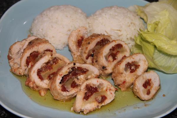 moje vcerajsie kuracie rolky plnene susenymi paradajkami,mozzarelou , k tomu ryza a salat ( mali sme aj na dnes )