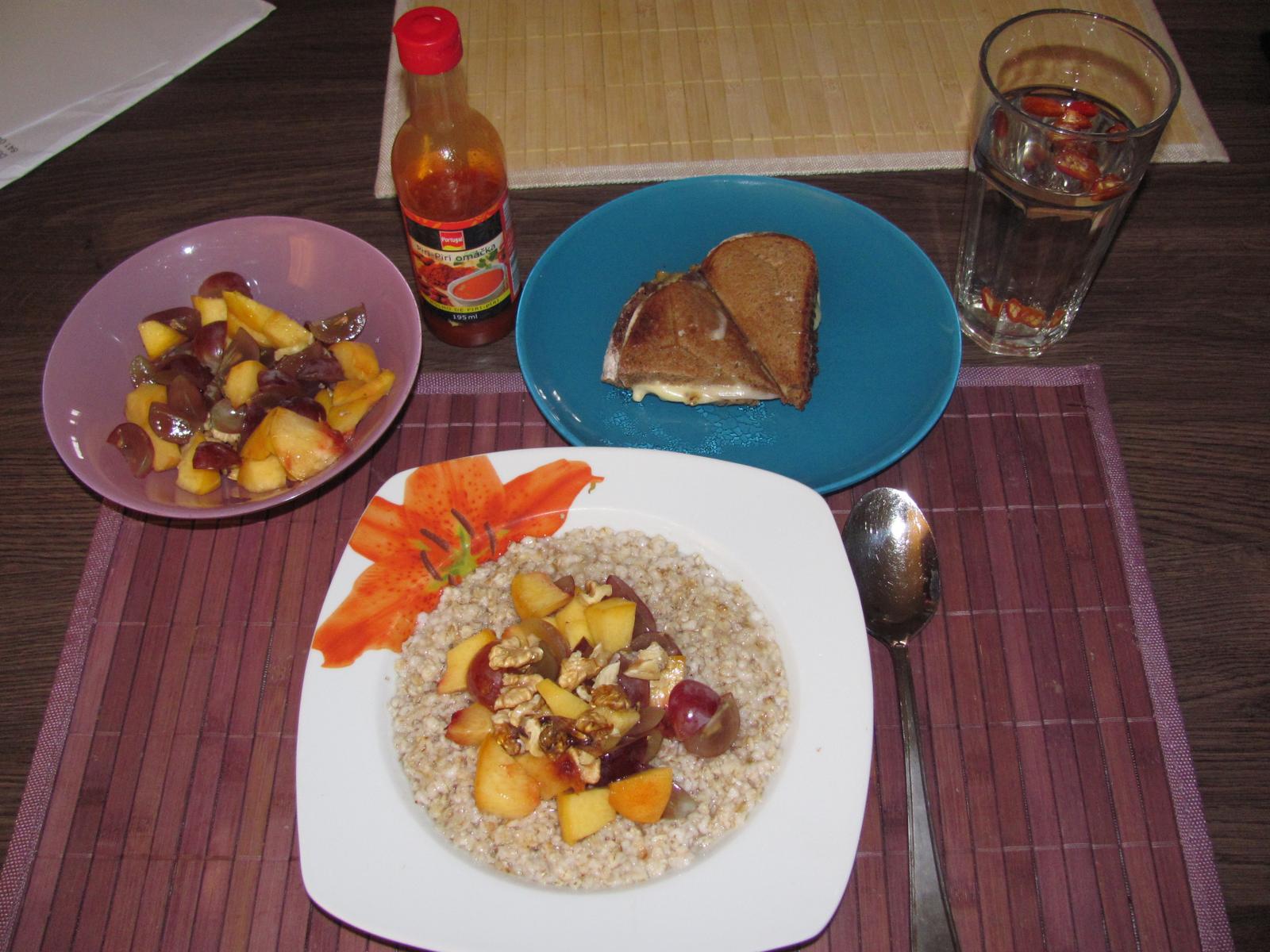 ja nevarim, mame zo vcera leb spravim ryzu k hovadziemu a chcem este pre malu na zajtra na ranajky tofu natierku so syrom a mrkvickou. a pripajam foto ranajok tehotnych 🙂 ovsena kasa s hroznom, broskynou, orieskami a medom a toast zo spaldoveho chleba so syrom a sunkou a este som si do neho dala piri-piri omacku- stilavinka nezaskodi 😵 a sipkovy cajik .strasne mi chuti rano alebo vecer nemozem jedavat kvoly kyseline... len skoda,ze moja mala nie a nie prist naskvelu chut ovsenej kase....