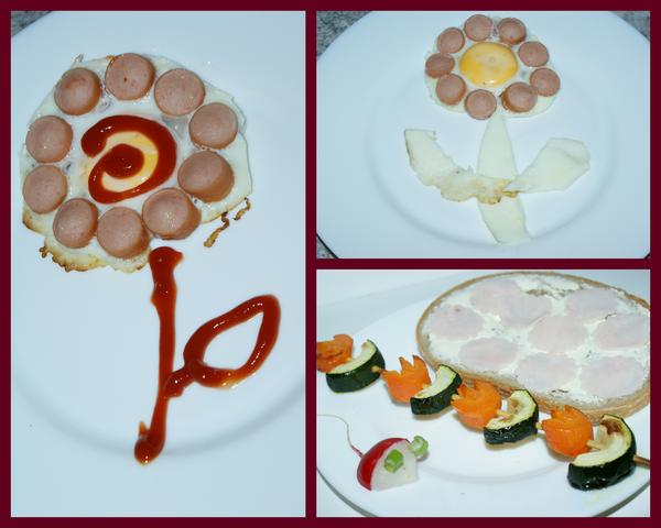 kremovu karfiolovu polievku, opekané kružalky (zemiaky nakrájané na krúžky) a opečené kuracie prsia nakrájané na rezance s Gyros korením a sojovou omáčkou
