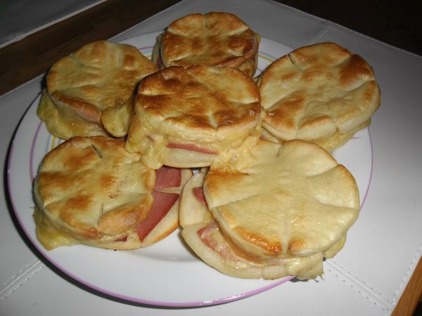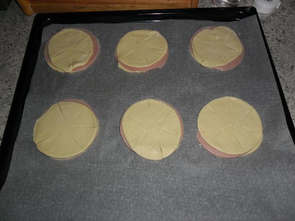 @nanulik moje nič zložité kysnuté cesto (toť jedna kočka uvažuje nad lístkovým) vykrojiť koliesko,dať koliesko salámky,syrček, cesto, potreť jajkom a na 180 dať piecť