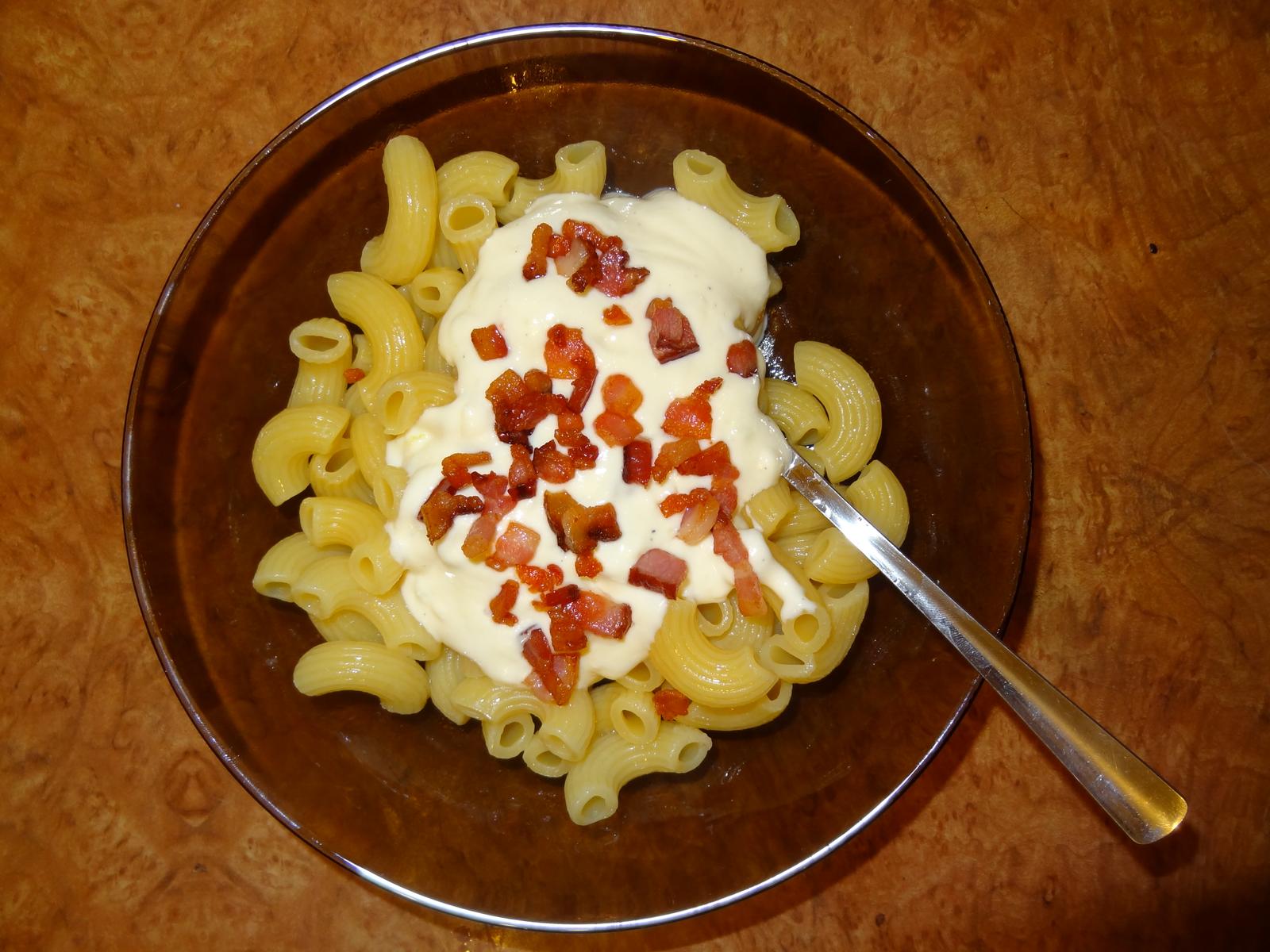cestovinky so syrovo- smotanovou omáčkou a na vrch opražená slaninka 🙂