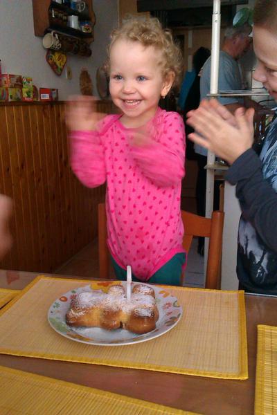 dnes sme nevarili, nemáme doma tatka a babka nás pozvala na obed a nabalila aj na zajtra 🙂...mali sme hovadziu polievku s rezancami, knedľu a sviečkovú....na také symbolické sfúknutie sviečky som malej spravila bábovkového maca, pretože bábovku miluje 🙂 a dnes má dva roky ...oslava s tortou sa odkladá o týždeň, keď už budeme mať doma aj tatka 🙂..sviečku sme fúkali na viackrát, lebo sa jej to veľmi zapáčilo :D