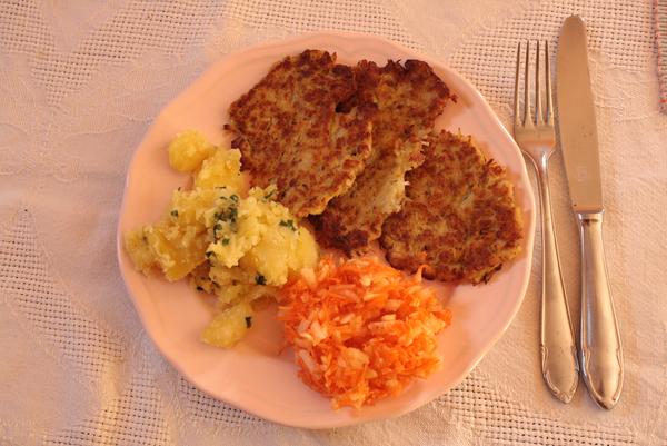 Ahoj, uvarila som karfiol a namocila ovsene vlocky. Karfiol popucis vidlickou a premiesas s vlockami, pridas jedno dve vajicka, restovanu cibulku na oleji s cesnakom, majoranku, sol, drvenu rascu a muku. A klasika na oleji alebo v rure. Su velmi chutne, nepiju tak mast ako klasicke zemiakove a nie su vodnate ako cuketove. Chrumkave a syte.