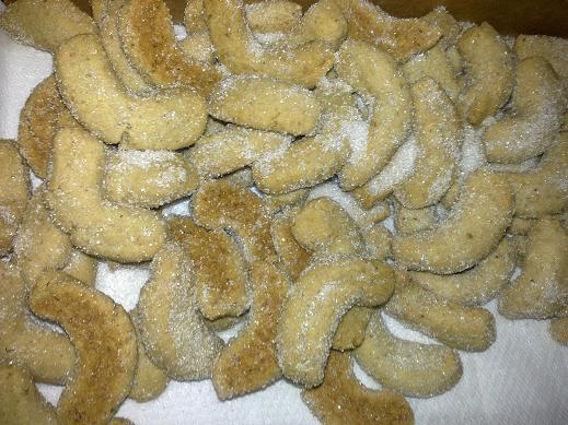 350g hladkej muky,120g vlasskych orechov,240g praskoveho cukru,260g masla al. rastlinneho tuku /ja davam heru/,1vajce,2PL kakaa, 1/2 lyzicky mletej skorice, stipka mleteho klinceka, citronova stava. a vanilkovy a praskovy cukor na obalovanie.