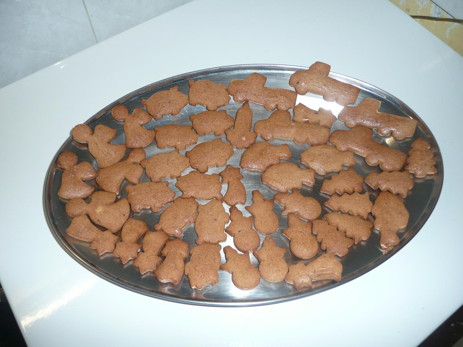 Už mám upečené : vanilkové rožky, medovníčky, pardubické perníčky, linecké kvetinky s džemom, škoricové hviezdičky, makové linecké kvietky s džemom, sušienky s kúskami orieškov, sušeného ovocia a čokolády, karamelové košíčky - tie už iba naplním, čokoládové srdiečka - naplním kokosovou plnkou, išelské tortičky - tiež už len naplním plnkou asi nugátovou alebo vanilkovou , oriešky - tiež naplním plnkou vanilkovou, karamelovou z každej trochu, guľky Marlenka a duté orechové trotičky,- to mám všetko už hotové, no a ešte idem piecť rožteky s citrónovou polevou, griláž bez Salka, šuhajdy, zasnežené hory - nepečené, medové rezy margaret, ananásovo-punčové rezy, trojhránky s orechami a medom, žabky - podobné ako parížske rožteky a ešte zázvorníky 😉