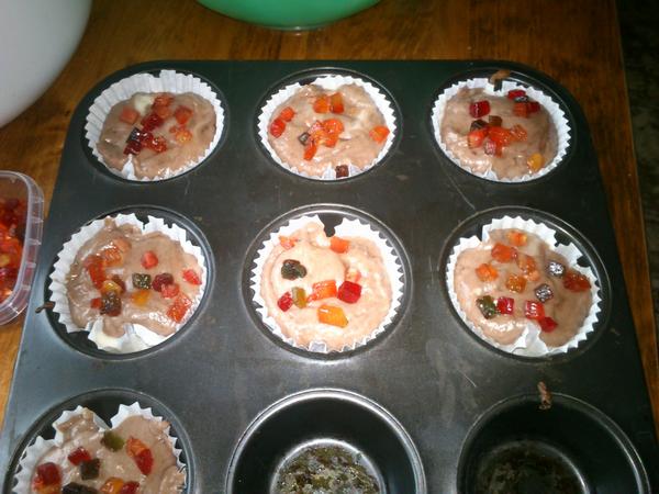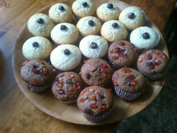 ahojte, u nás dnes konečne nemäsový deń, rascová polievka s rozšľahaným vajíčkom a haluškami, parené buchty s lekvárom, posypané grankom, orechami aj makom, ako kto má rád a aby mi pečenie nechýbalo, tak som dnes piekla 😅 mama už ide zajtra do práce, na štedrý deń mala meniny, tak robila pre kolegov a kolegyne chlebíky, očká a pod., že sladkého budú ma´t všetci po Vianociach dos´t, ale že predsa by len niečo sladké urobila, že muffinky a ja hovorím, nechaj tak, ja upečiem, už mi to chýba 😀 a tak som robila tri druhy muffinov, dvojfarebné - spodok kakaové cesto, na to kocka kinder čokolády, bledé cesto a na vrch lieskový orech, druhé dvojfarebné, spodok bledé cesto, na to koliesko banánu, kakaové cesto a vrch som posypala kandizovaným ovocím, a tretie som robila s kúskami jabĺk, orechov, hrozienok a sušeného ovocia 🙂