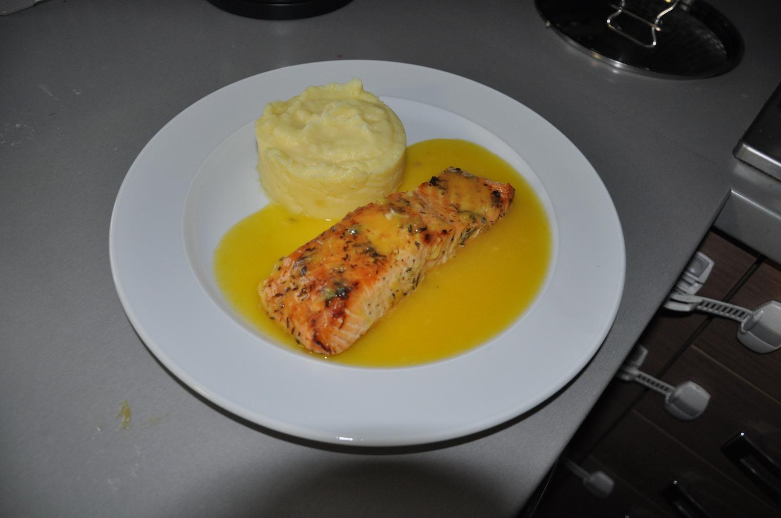 a štvrtok kurací vývar a losos v cestíčku so špenátovým pyré