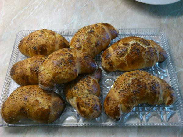 @mravvcek plnené : robím velký kruh a pokrájam na 8 trojuholníkov a tak točím od širšieho konca kde dám aj plnku, a obyčajné rohlíky robím loptičky a vyválkam na dlhé ovaly a tak ich točím, a žemle len nechám loptičky a potrem vajíškom a dám syr, alebo aj pizzové , to dám pizza krém na to plát šunky a plát syra.