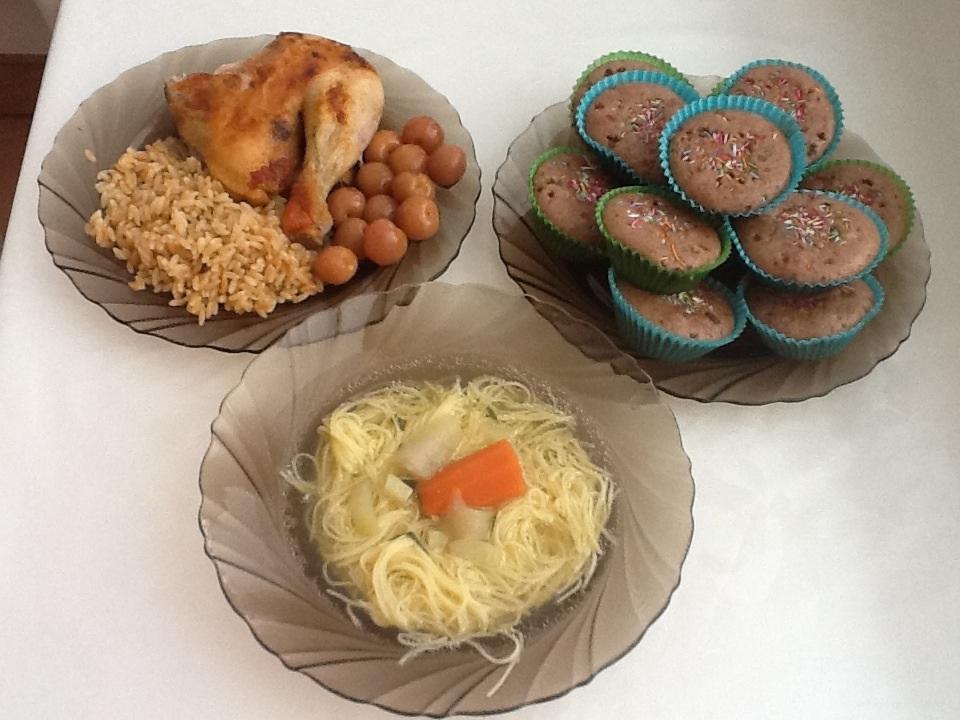 Ahojte.dnes polievka s bravčových kostí s kopou zeleniny a domáce slížiky.rezne s kukuricovo-hrachovou ryžou a domáci kompot hrušiek.včera som robila mafinky tak sú aj na dnes.jedny plnené malinová´ým džemom s čokoládou a druhé kokosové...super sú..