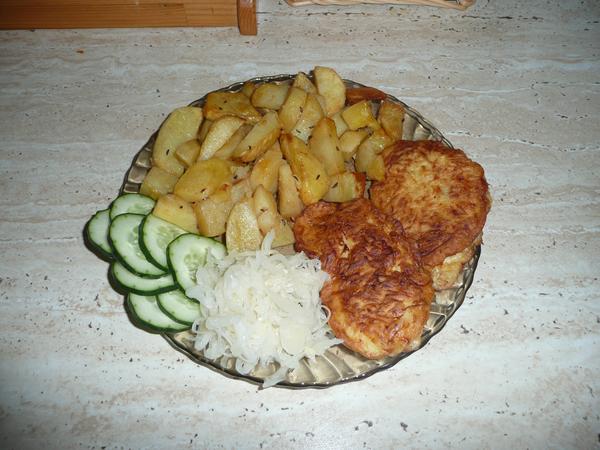 ahojtem, tak my sme sa vrátili z výstavy psov, parádne bolo a čakal nás doma obed, babka s dedkom navarili klasika slepačiu polievku, vyprážané kuracie rezne ale boli marinované v kyslej smotane, tak sú úžasne šťavnaté, jedny boli obalené klasika v strúhanke a v druhých bol k strúhanke pridaný strúhaný syr, ďalšie bola pečená krkovička na plátky na leči a cibuli, ryža, opekané zemiaky, ĺadový šalát, 😉
