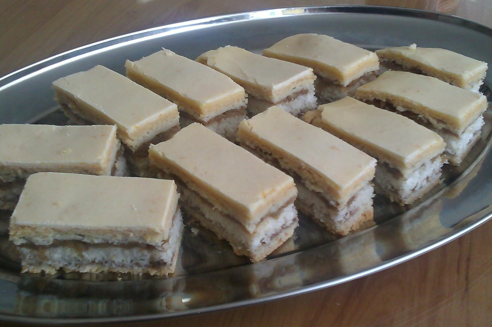 Prvé cesto vyvaľkáme prenesieme ho na plech,natrieme ho lekvárom.Na lekvár dáme kokosovú plnku.Na kokosovú plnku dáme nastrúhané jablká.Na jablká položíme druhé cesto.