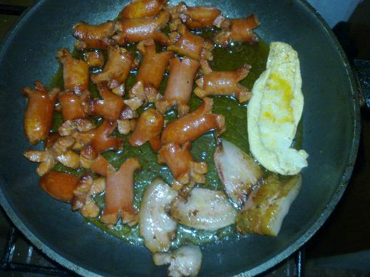 Hrachovou kaši s opečeným párkem a vajíčkem natvrdo.