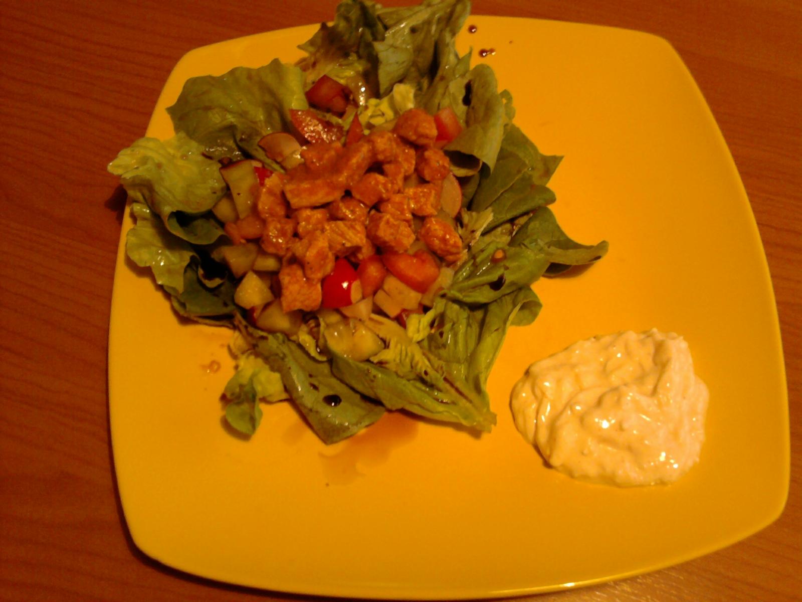 u nás dnes zeleninový mix s troškou mäsa pokvapkaný vinným octom, cesnakovo syrovým dressingom a k tomu celozrná bagetka