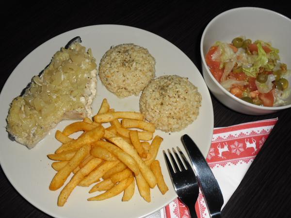 ahojte u nás zeleninová kremová polievka s opečeným chlebíkom a žralok na zázvore a paprike, celozrnna rýža, hranolky a miešaný šalat