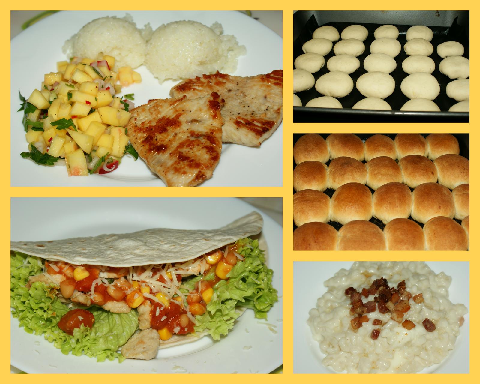 ahojte po nejakej odmlke.. xoroby ma vyradili z prevadzky, ale tak jest sa muselo... nedela - morcacie na prirodno s ryzou a mangovym salatom, pondelok - bryndzove halusky, utorok som ledva zvladla cesto s tvarohom a dnes mm naryxlo tortilly s kuracim masom, biele fazule v paradajkax a kukurica,salat,syr a kysla smotana...a pecene buxty ako odmena pre mm za intenzivnu starostlivost 🙂) a od dnes ATB,tak hadam uz bude lepsie....