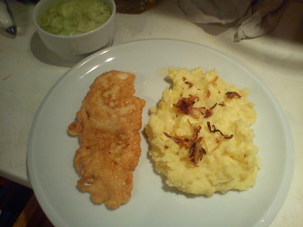 Dala som si variť asi 15ks stredných zemiakov v šupke, vychladnuté som ošúpala a pokrájala na kolieska. Medzitým som si 1/2kg bravčového stehna nakrájala na malé kocky, okorenila a sprudka opiekla na masle, podliala a nechala dusiť do mäkka.