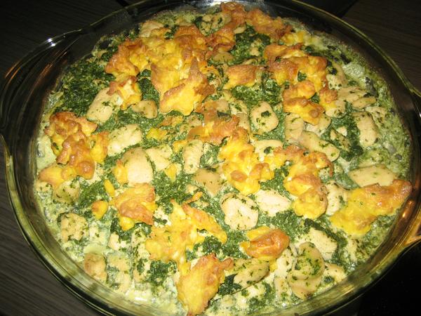 @raza jasné 🙂 na panvici si opečieš pokrájané kuracie mäsko, keď je opečené, osolíš a dáš trochu sójovej omáčky, potom pridáš mrazený špenát a chvíľu dusíš, podleješ sladkou smotanou. Kým sa ti toto dusí, ošúpeš a nakárajaš si zemiaky, ktoré dáš variť so soľou a trochou rasce. Keď sú uvarené, scedíš, dáš do zapekacej misy, pridáš mäso a ešte si urobíš takú redšiu praženicu z 3 vajec (alebo z koľkých chceš) a dáš na vrch mäska....na 15 minút zapiecť v rúre a hotovo