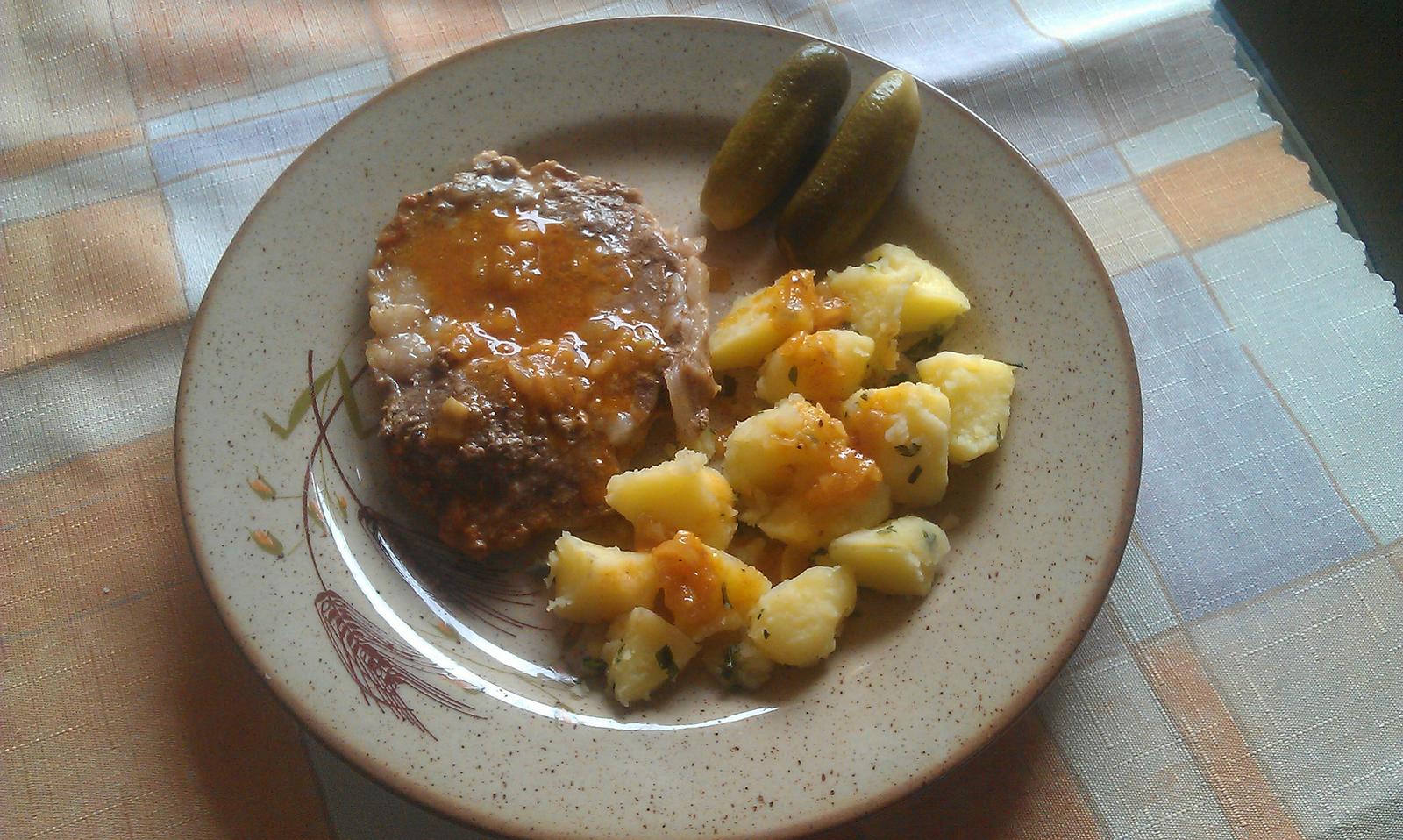 dnes rychlovka vývar s masem a nudlemi, vepřová pečeně, šťouchané brambory s cibulí a špekem