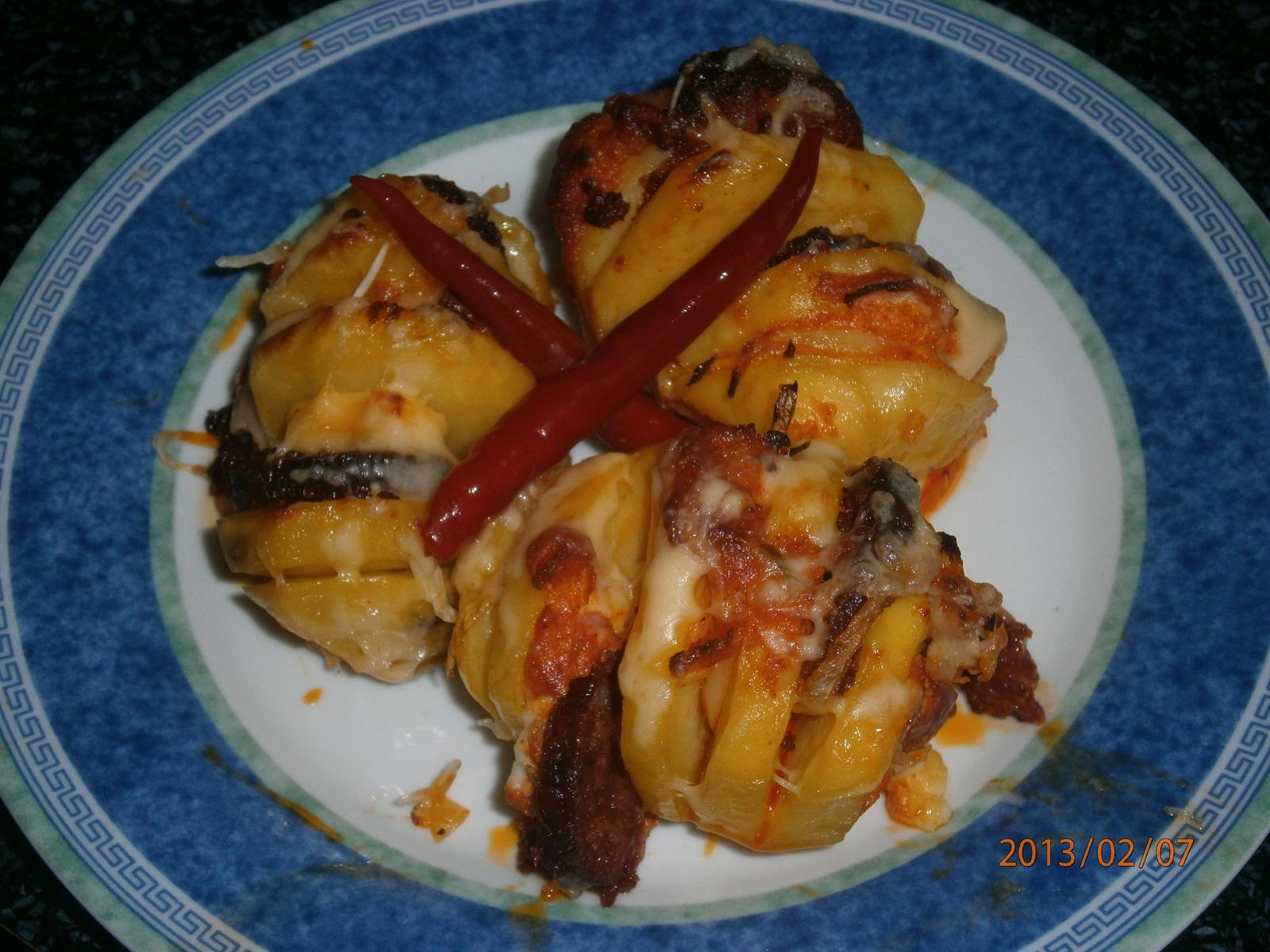 zemiaky očistíme, nakrájame ich do 2/3 a plníme do zárezov podľa chuti (ja som dala klobásku, syr, cibuľu ... syr sa dá obmieňať, niekedy plesnivý, inokedy mozarellu, alebo tavený vždy to potom má inú chuť) ... dáme piecť do rúry, kombinovala som pečenie a gril 180C hodinku. Minutu pred dopečením som to ešte posypala strúhaným syrom a zapiekla aby sa syr rozpustil ... hotovo 🙂